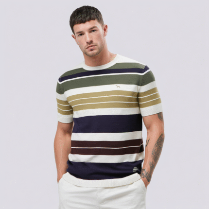 Men’s Striped Knit T-Shirt Viscose Blend Short Sleeve Crew Neck Navy and White Tee