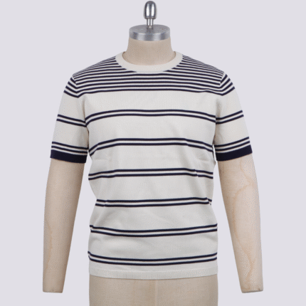 Multi-color horizontal stripes (navy, mustard, red, white); Donegal tweed knit texture; Crew neck.