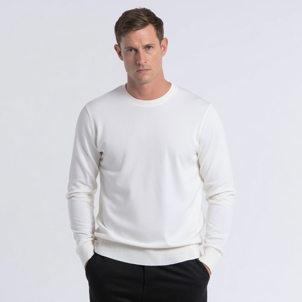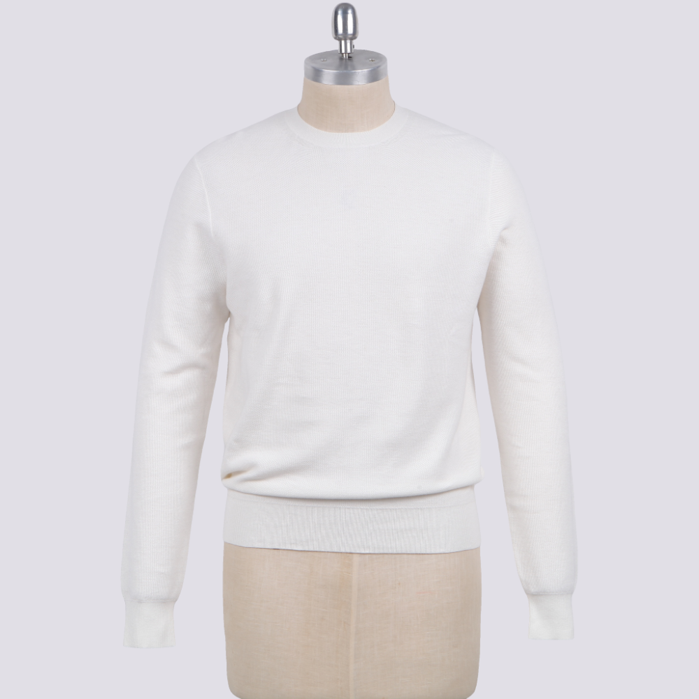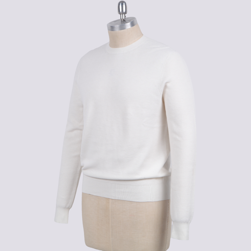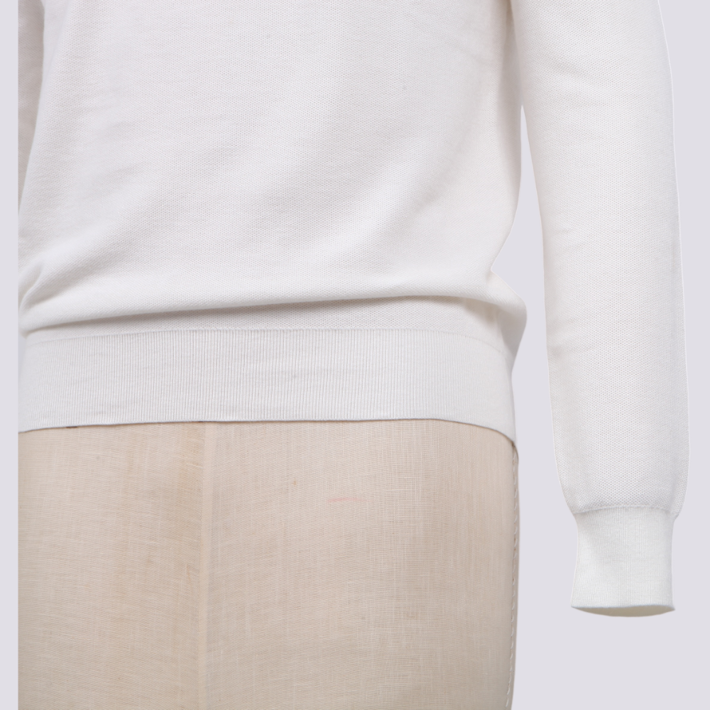 Luxury Men’s Knit Top Cotton Silk Nylon Blend Long Sleeve Fine Gauge Pullover Sweater White