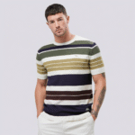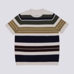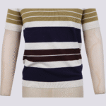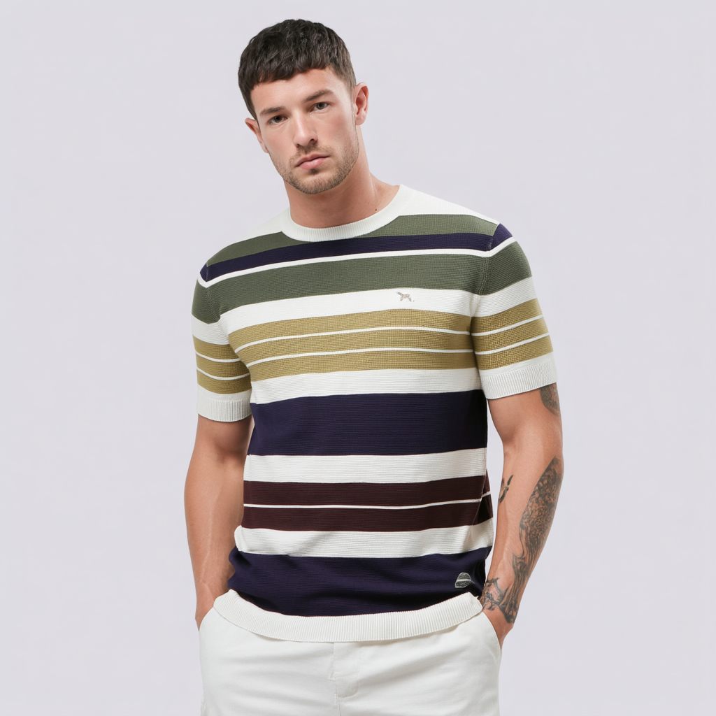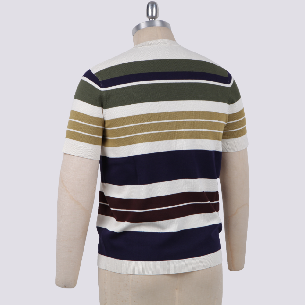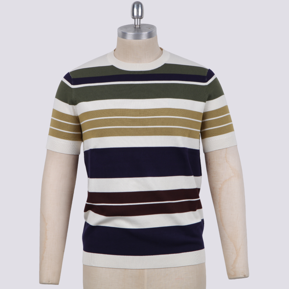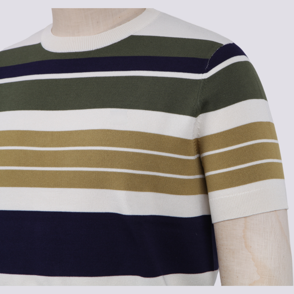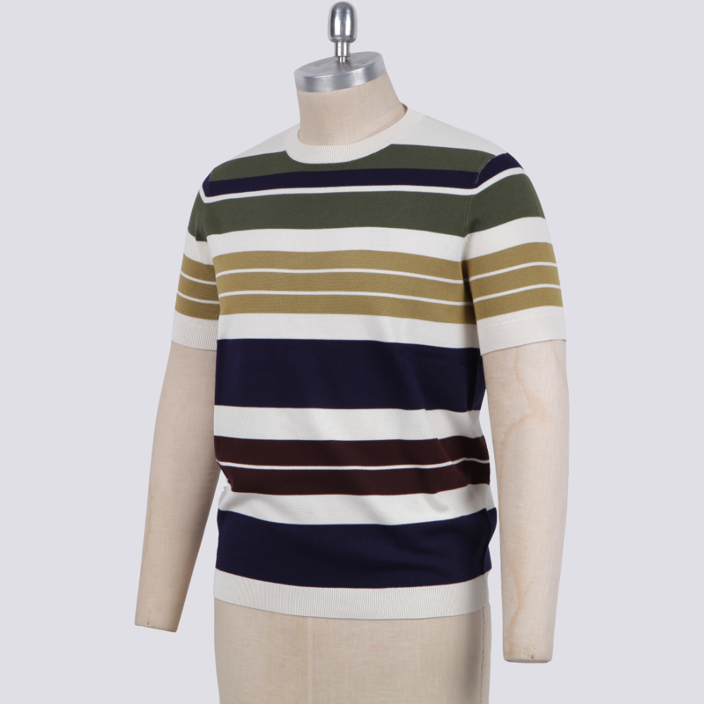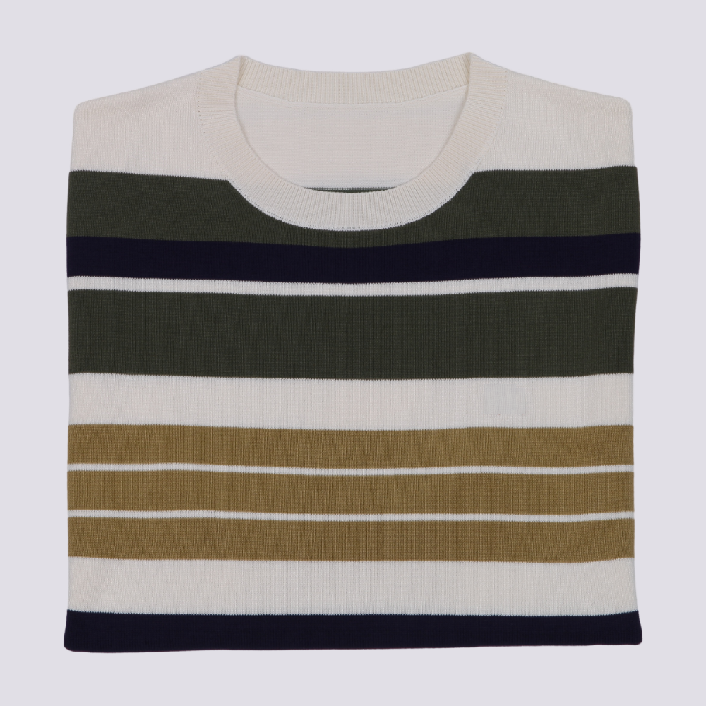 Multi-color horizontal stripes in olive green, brown, beige, and white.