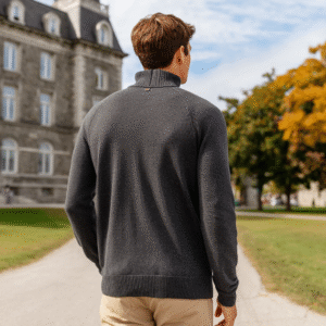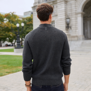 Key Design Features – Reinforced elbow patches, structured knit, full-zip front